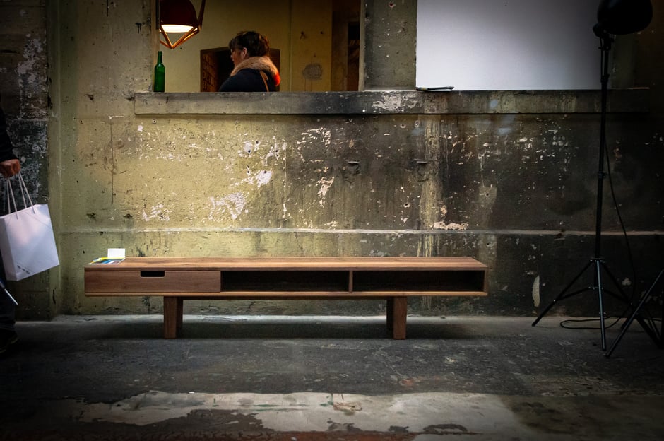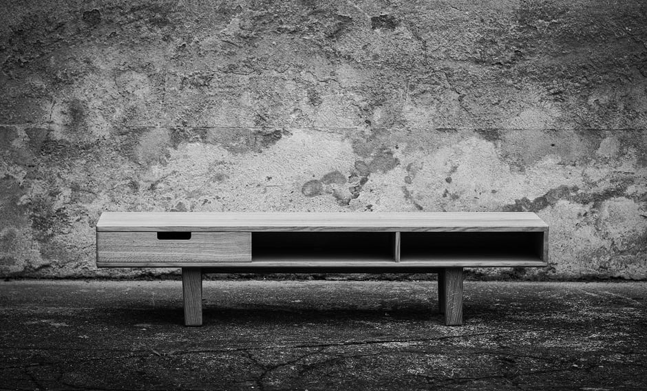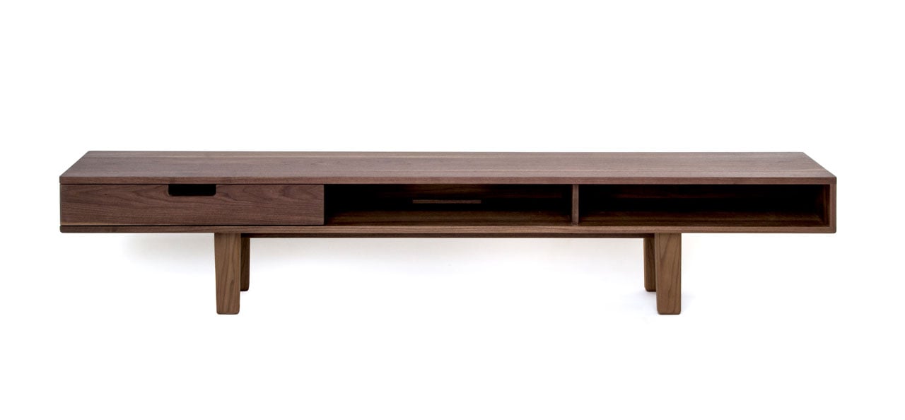 Lowboard: B auf Wunsch, T 380, H 375 mm / Fachhöhe 110 mm / auf Wunsch Schubladen und Kabeldurchlass / Materialstärke 20 mm / auf Anfrage in weiteren Massen / europäischem Massivholz / Foto: Schwarznuss